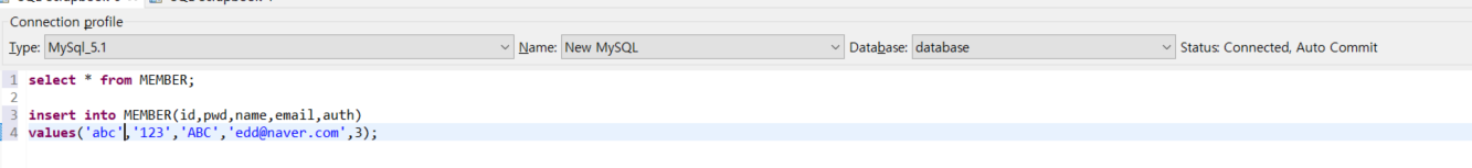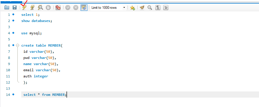 쿼리문을 입력하고 번개버튼을 누르면 커밋이 된다.