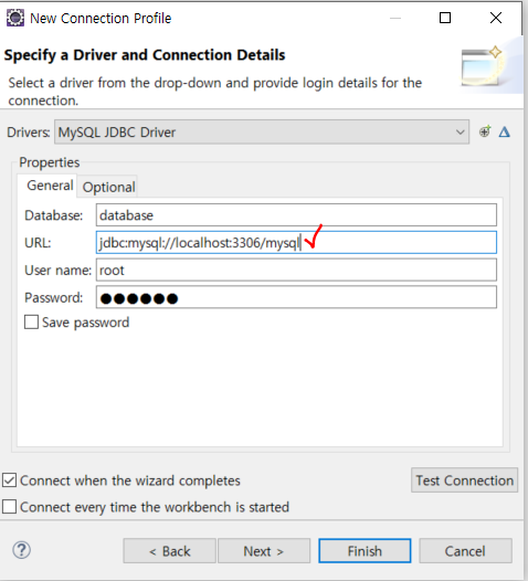My SQL에 등록했던 UserName과 Password로 Test Connection을 하여 연결을 확인한다.