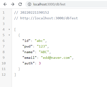 주소창에 db/base을 입력하여 입력된 data가 list 형식으로 잘 출력되는지 확인