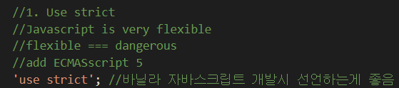 바닐라 자바스크립트 개발시 제일 먼저 'use strict'를 선언해주는 게 좋다.