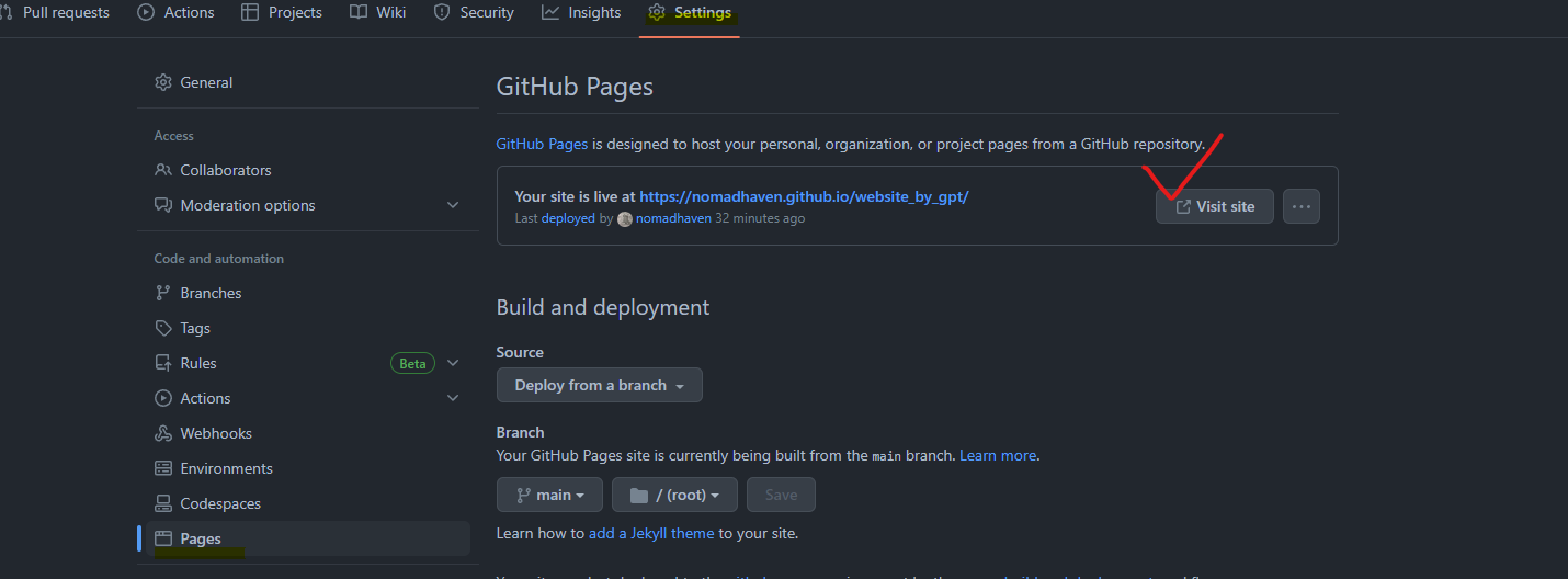 30초쯤 지나면 배포가 완료되고 Visit site 버튼 들어가면 본인의 페이지를 확인할 수 있다.