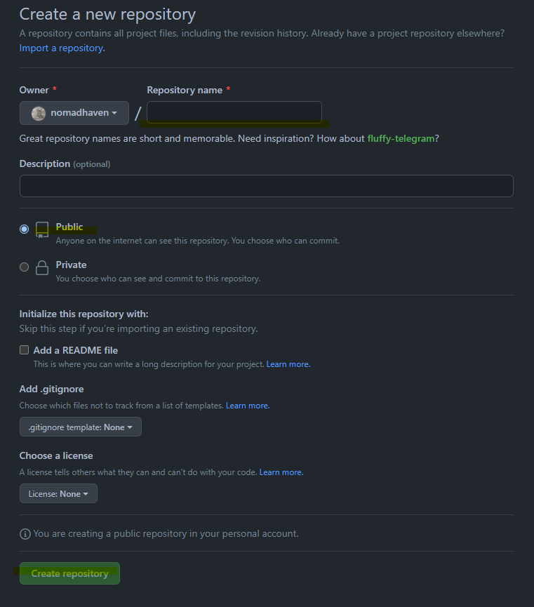 필요값인 Repository name을 입력하고, 설정은 public으로 유지한 뒤