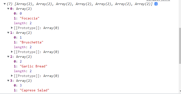n번째 인덱스의 n번째 배열의 제일 첫번째 인덱스 값은 숫자 n이며 두번째 인덱스 값이 음식인 value 값이다