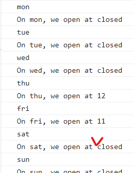 On sat, we open at closed라는 예상치 못한 값이 출력되고 만다.
