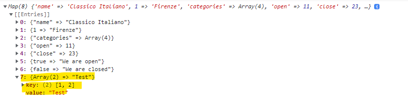 [1,2] 라는 배열을 key값으로 추가하고 'Test'라는 Value를 추가했다.