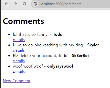 <%= %>는 GET 명령어로 받아온 comments 배열의 element 프로퍼티인 comment, username, id값을 반환하고 있다.