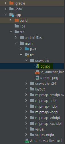 본인이 배경으로 지정하고 싶은 이미지파일 bg.jpg를 drawble폴더에 저장