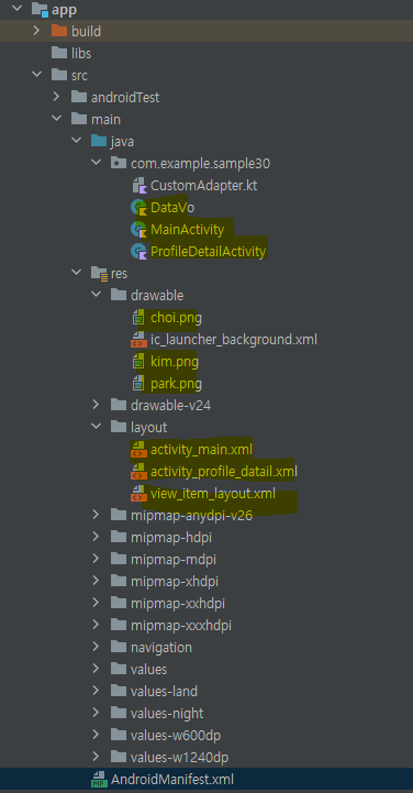 com.example.sample30 : CustomAdapter.kt / DataVo / MainActivity / ProfileDetailActivity 생성
