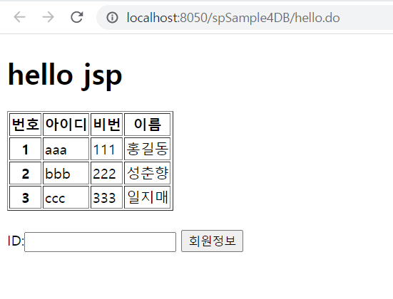<th>번호</th><th>아이디</th><th>비번</th><th>이름</th>